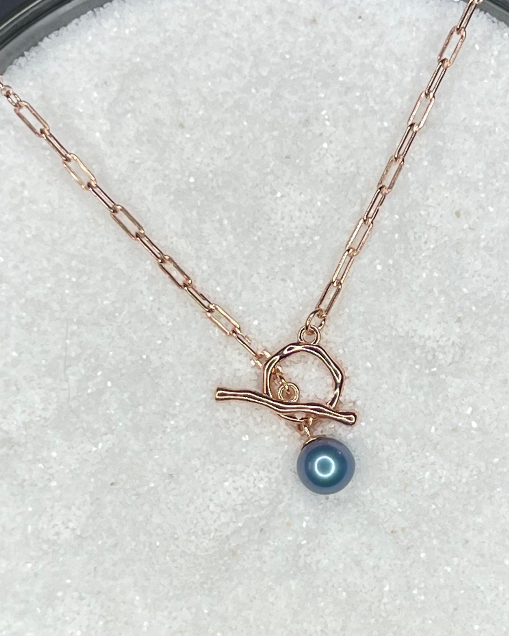 This necklace is solid sterling silver with rose gold plating and will come with two akoya oyster openings! You are welcome to purchase more rounds to have more color options - see oyster openings tab!